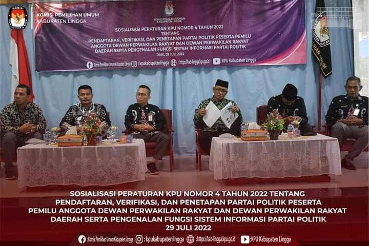 KPU Kabupaten Lingga pada hari ini, Jum'at 29 Juli 2022 menyelenggarakan Sosialisasi PKPU Nomor 4 Tahun 2024 tentang Pendaftaran, Verifikasi, dan Penetapan Partai Politik Peserta Pemilihan Umum Anggota Dewan Perwakilan Rakyat dan Dewan Perwakilan Rakyat Daerah serta Pengenalan Fungsi Sistem Informasi Partai Politik (SIPOL) di Hotel Lingga Pesona Daik Lingga, pukul 08.30 WIB. Sosialisasi tersebut diselenggarakan bertujuan untuk memberikan informasi kepada partai politik di tingkat kabupaten Lingga dan stake holder terkait guna menyambut Tahapan Pendaftaran dan Verifikasi Peserta Pemilu yang dimulai pada tanggal 29 Juli 2022.