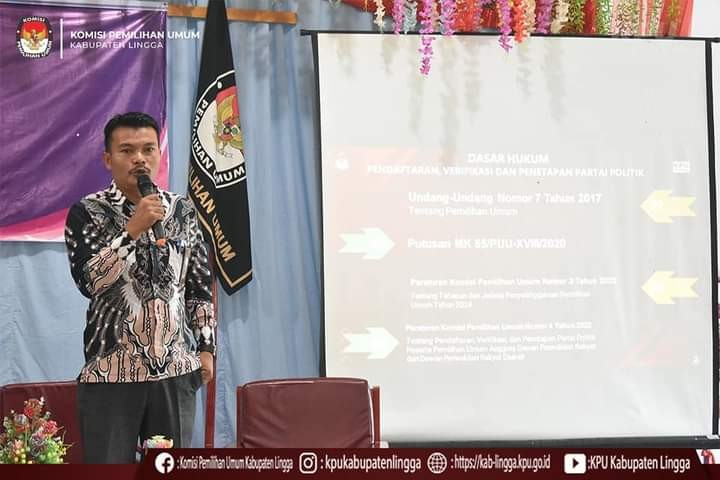KPU Kabupaten Lingga pada hari ini, Jum'at 29 Juli 2022 menyelenggarakan Sosialisasi PKPU Nomor 4 Tahun 2024 tentang Pendaftaran, Verifikasi, dan Penetapan Partai Politik Peserta Pemilihan Umum Anggota Dewan Perwakilan Rakyat dan Dewan Perwakilan Rakyat Daerah serta Pengenalan Fungsi Sistem Informasi Partai Politik (SIPOL) di Hotel Lingga Pesona Daik Lingga, pukul 08.30 WIB. Sosialisasi tersebut diselenggarakan bertujuan untuk memberikan informasi kepada partai politik di tingkat kabupaten Lingga dan stake holder terkait guna menyambut Tahapan Pendaftaran dan Verifikasi Peserta Pemilu yang dimulai pada tanggal 29 Juli 2022.