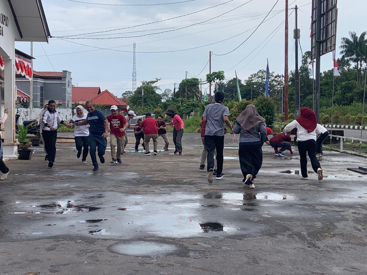 Kegiatan diawali dengan jalan santai yang diikuti seluruh keluarga besar KPU Kabupaten Lingga. Usai pemanasan dengan berjalan santai, peserta dibagi menjadi beberapa grup untuk mengikuti tujuh permainan seru yang dirancang untuk melatih kekompakan, sportivitas, dan kerja sama tim. Meskipun sempat diguyur hujan, antusiasme peserta tak surut, bahkan suasana menjadi semakin hangat dengan canda tawa di tengah permainan.