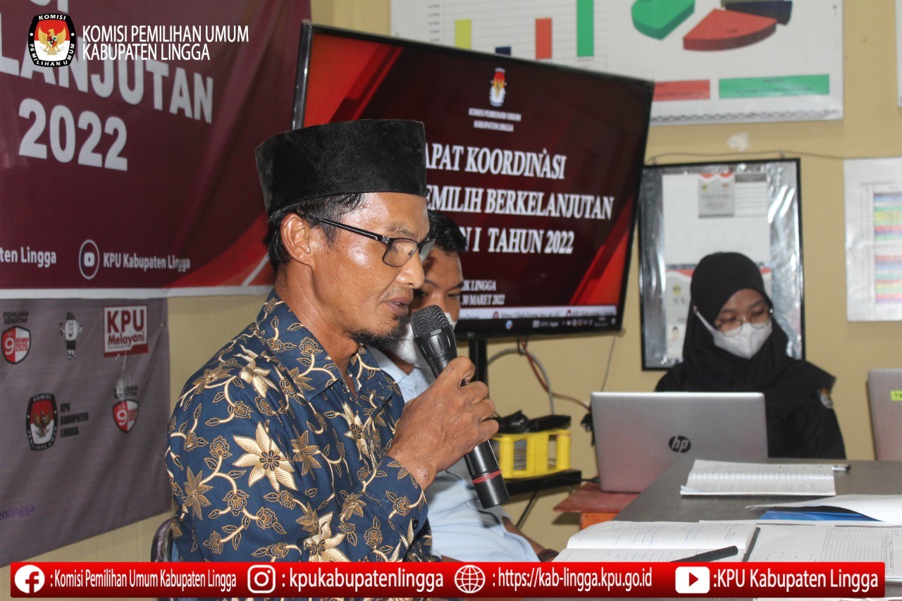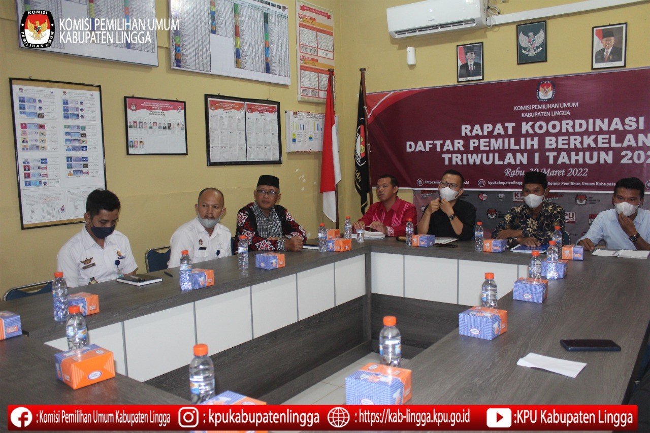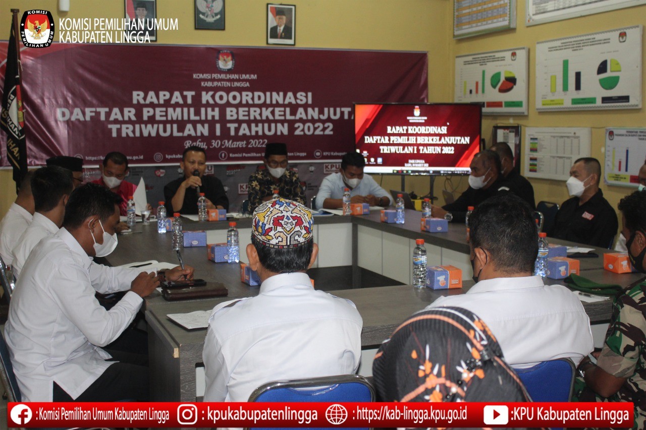 Daik Lingga, kab-lingga.kpu.go.id - Rabu (30/3) KPU Kabupaten Lingga melaksanakan Rapat Koordinasi Daftar Pemilih Berkelanjutan Triwulan I Tahun 2022 bertempat di ruang rapat sekretariat KPU Kabupaten Lingga. Rapat tersebut dihadiri oleh Ketua, Anggota, Sekretaris, Kepala Sub Bagian, Staf Sekretariat KPU Kabupaten Lingga beserta Stakeholder yang diundang yaitu Bawaslu Kabupaten Lingga, Disdukcapil, Polres Lingga, Dandim Tanjung Pinang, Kesbangpol, Lapas Dabo, Dinas Pemberdayaan Masyarakat Desa (DPMD).