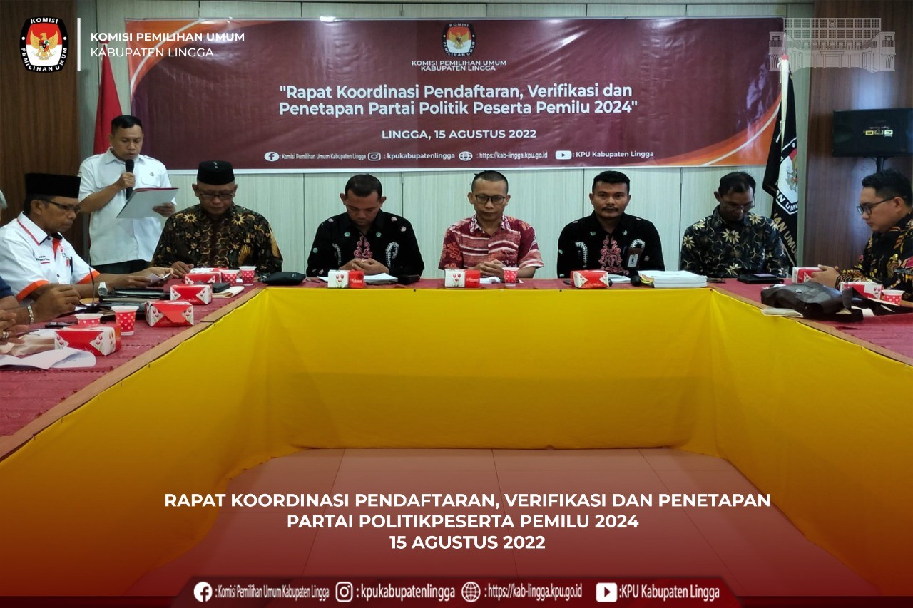 Daik Lingga, kab-lingga.kpu.go.id - KPU Kabupaten Lingga melakasanakan Rapat Koordinasi Pendaftaran, Verifikasi, dan Penetapan Partai Politik Peserta Pemilu tahun 2024 yang dihadiri Bawaslu Kabupaten Lingga dan Perwakilan partai Politik di One Hotel Dabo Singkep, Senin (15/8). Acara yang dimulai pada pukul 09.00 dibuka oleh Hasbullah Ketua KPU Kabupaten Lingga menyatakan bahwa kegiatan ini bertujuan untuk menyatukan persepsi antara KPU Lingga dengan partai politik dalam hal verifikasi administrasi maupun faktual. Fungsi dari KPU sendiri adalah melayani dengan segenap kemampuan agar pesta demokrasi pada 2024 mendatang dapat suskes dilaksanakan. Acara dilanjutkan materi yang disampaikan oleh Rio Akmal Bukit anggota Divisi Teknis Penyelenggaraan pendaftaran partai politik prosesnya akan dimulai pada tanggal 16 Agustus 2022, dan terdapat 24 parpol yang dinyatakan lengkap saat mendaftar di KPU Republik Indonesia serta ada 16 Parpol yang masih dalam proses pemeriksaan administrasi kelengkapan di KPU Republik Indonesia.