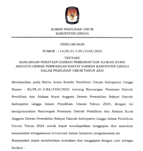 Daik Lingga, kab-lingga.kpu.go.id – Saat ini Komisi Pemilihan Umum Kabupaten Lingga telah memasuki Tahapan Rancangan Penataan Daerah Pemilihan dan Alokasi Kursi Anggota Dewan Perwakilan Rakyat Daerah Kabupaten Lingga dalam Pemilihan Umum Tahun 2024, maka dari itu kami ingin menyampaikan pengumuman yang berisi rancangan daerah pemilihan dan alokasi kursi yang akan menjadi bahan pertimbangan.