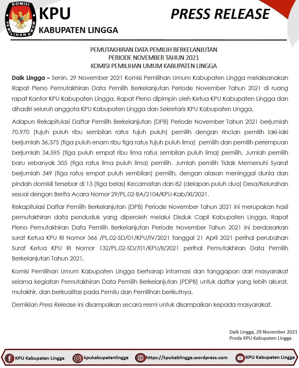 Dari Rapat Pleno yang dilaksanakan ditetapkan Rekapitulasi DPB Kabupaten Lingga periode bulan November tahun 2021 sebagai berikut :