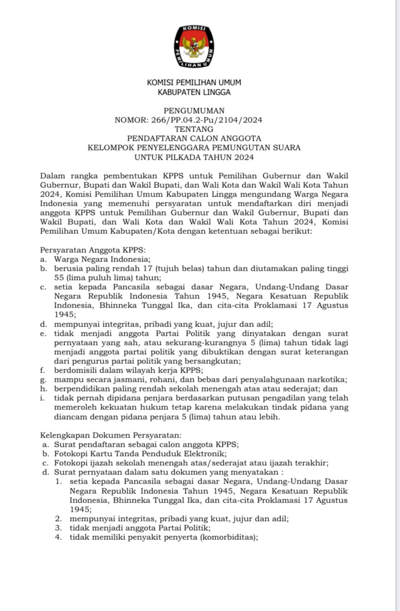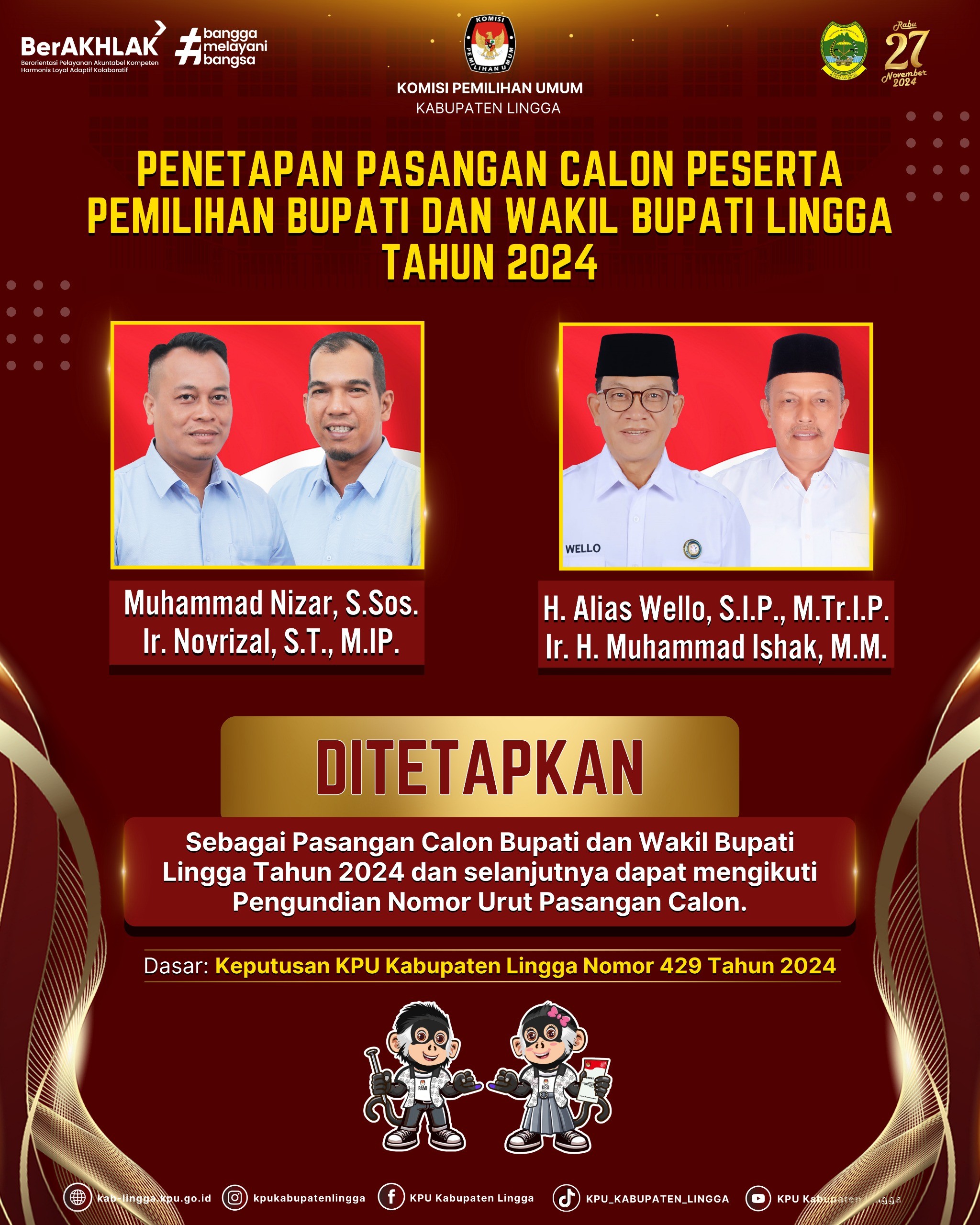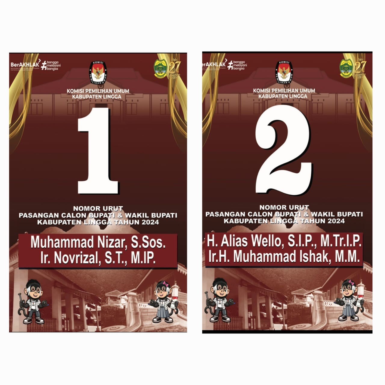 Selasa 24 September 2024 Tim Kampanye pasangan calon nomor urut 1 Muhammad Nizar,S.sos dan Ir.Novrizal, S.T.,M.IP dan pasangan calon nomor urut 2 H. Alias Wello, S.I.P., M.Tr.I.P. dan Ir. H. Muhammad Ishak, M.M. datang telah menyampaikan Tim Kampanye dan petugas penghubung Kampanye kepada KPU Kabupaten Lingga. Adapun selengkapnya dapat dilihat pada link di bawah ini: