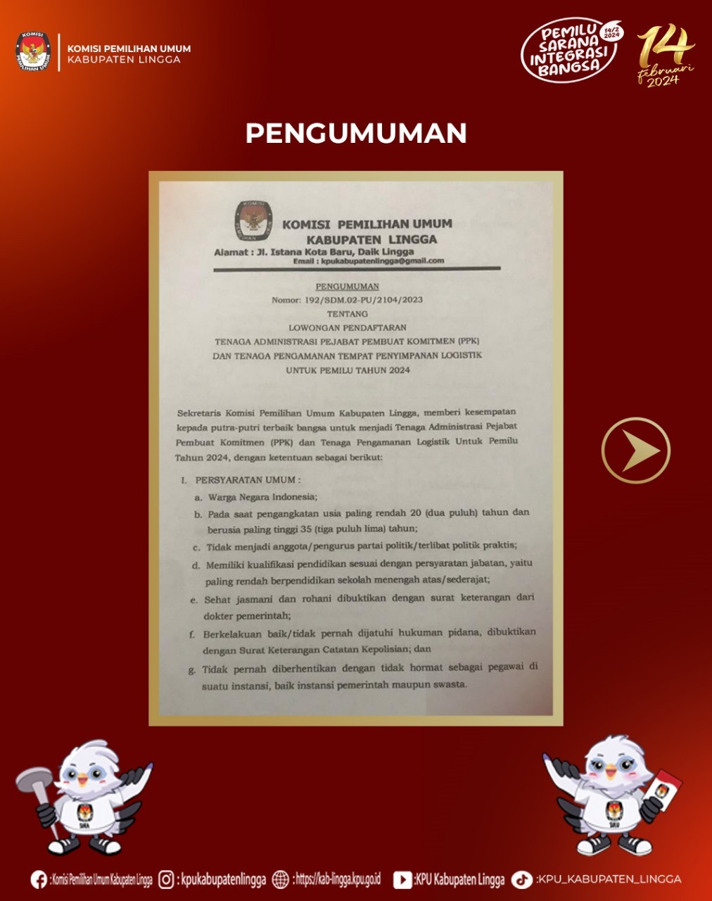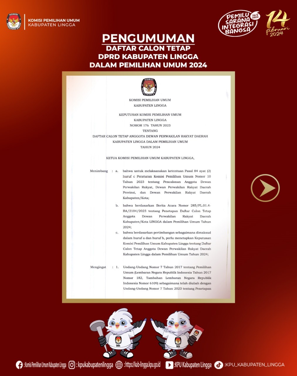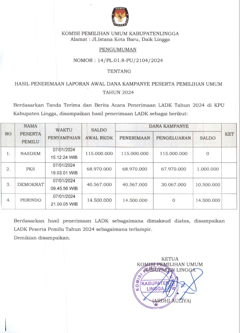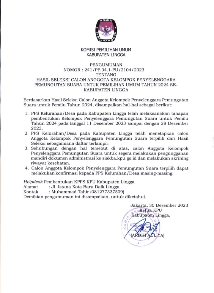 Lingga, Komisi Pemilihan Umum Kabupaten Lingga telah mendengar Putusan Dewan Kehormatan Penyelenggaran Pemilu (DKPP) Republik Indonesia atas dugaan pelanggaran Kode Etik Peneyelenggaraan Pemilu yang dilakukan oleh Ketua dan Anggota Komisi Pemilihan Umum Kabupaten Lingga yang dibacakan pada tanggal 4 Desember 2023. Isi dari Putusan DKPP RI untuk Perkara Nomor 113-PKE-DKPP/IX/2023 antara lain :